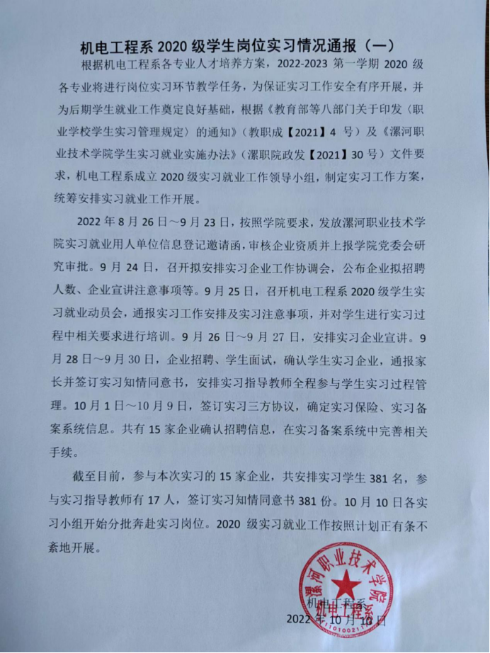 suncitygroup太阳成集团2020级员工岗位实习情况通报(一)