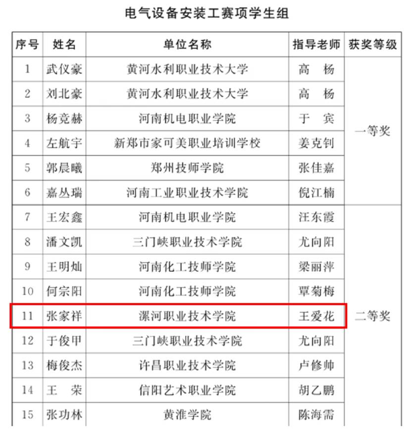河南省工业和信息化技术技能大赛是省级行业一类赛,由省工业和信息化厅、人力资源社会保障厅、总工会和机关事务管理局4部门共同主办,旨在弘扬劳动精神、劳模精神、工匠精神,培养更多青年高技能劳动者紧跟时代发展,抓住时代机遇,树立技能成才之心,胸怀技能报国之志,为中原崛起-推进中国式现代化建设贡献力量。本届大赛共设置碳排放管理员、多工序数控机床操作调整工、电气设备安装工、电子设备装接工四个赛项,来自全省93家企业和80所院校的538名选手参加本次比赛。张家祥同学在电气设备安装工赛项中沉着应对,圆满完成了电气原理图的绘制、电气线路的安装、PLC控制程序的编写和调试等任务,赢得了评委好评,最终斩获二等奖。