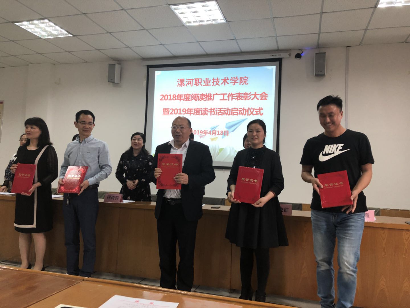 会上,学工部部长程传蕊致辞。图书馆馆长陈晓红总结汇报了2018年度阅读推广活动开展情况,对今后的工作进行安排。思想政治理论部主任石俊霞宣读读书活动获奖名单。院团委书记周茜宣读2019年度读书活动方案。读者代表宣读读书活动倡议书。