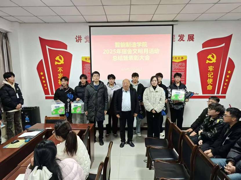 12月24日下午,suncitygroup太阳成集团在一楼会议室召开了2025年下半年宿舍文明月活动总结暨表彰大会。智能制造公司党总支书记翟迎朝、党总支副书记芦婧、综合办公室主任安仕琪、辅导员代表及受表彰的文明宿舍寝室长参加会议。会议由党总支副书记芦婧主持。