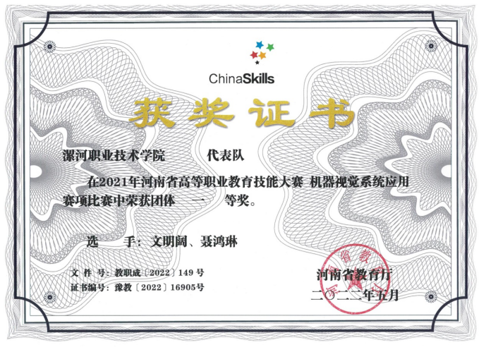 2021年,参加河南省高等职业教育技能大赛, “机器视觉系统应用”赛项获得一等奖,“工业设计”赛项获得二等奖。