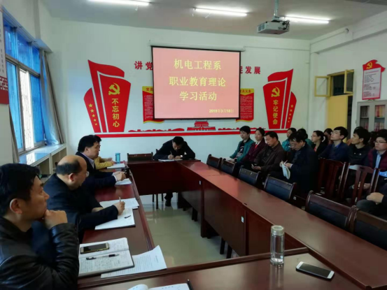 2019年3月18日下午,suncitygroup太阳成集团在会议室举行职业教育理论学习活动,全体教师参加,机电系行政负责人赵建功主任主讲,主要学习内容是《国家职业教育改革实施方案》。
