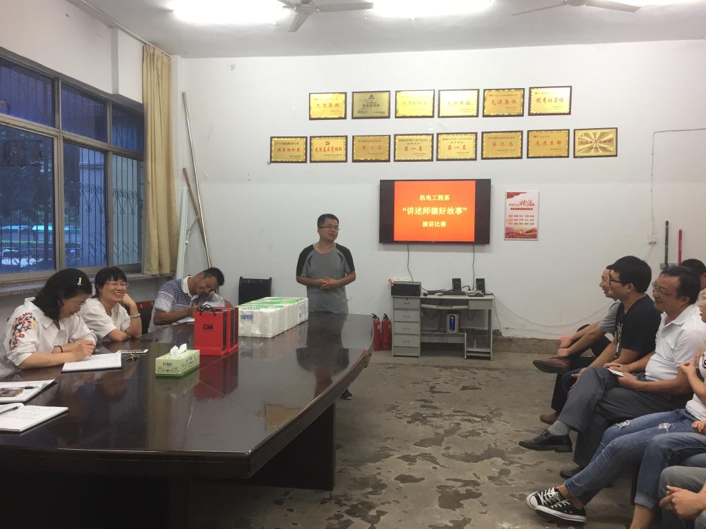 比赛由各教研室、处室推选出一名参赛选手,抓阄决定出场顺序开始。各位参赛选手不唱高调、不浮夸,真真正正的讲述身边的师德模范,讲述机电系平时默默为教学、育人不断奉献自己的领导们和老师们。